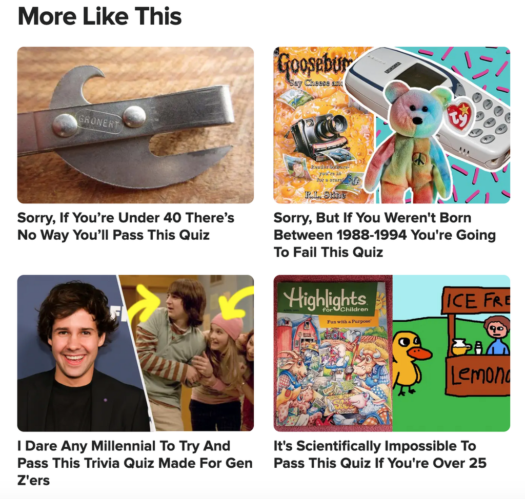 This ties into the recent, wider discourse between generational differences and the assumptions about them. BuzzFeed has quite a few interactive quizzes that use a similar format, which are always linked at the bottom of the page.