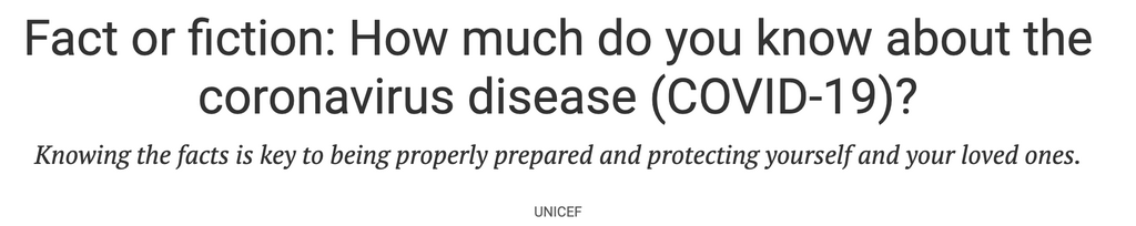 This quiz from Unicef tackles misinformation on the global COVID-19 pandemic, by asking people to see if they can distinguish what the key coronavirus facts really are. It came online in March 2020 and, at the time of writing, already has over 177K engagements.