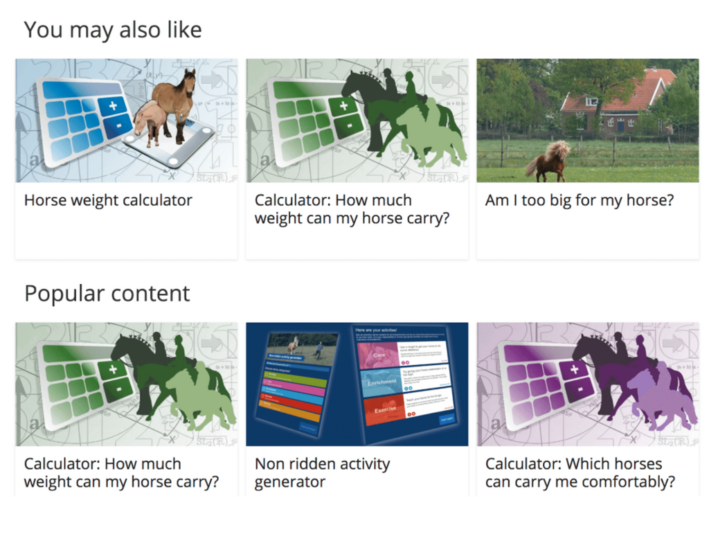 In the “What breed of horse can carry me?” example, the audience-known variable is weight. The author-provided variable is the weight certain horses can bear. The result of the calculation is a list of horses appropriate for each individual’s weight.