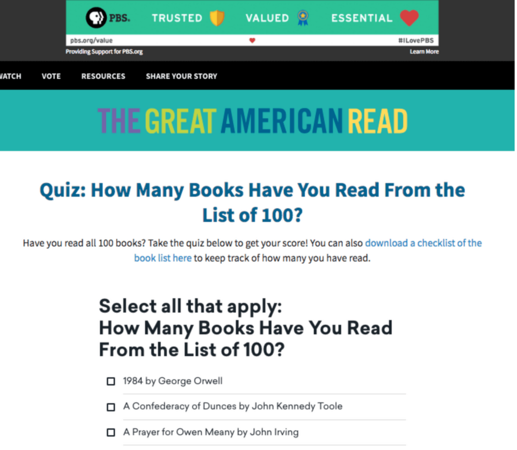 NPR’s version of the How-Educated-Are-You-Quiz has gained over 13k interactions since it’s launch in 2018. The format offers a downloadable checklist which makes this quiz a bit more meaty than others in the “how smart are you?” category.