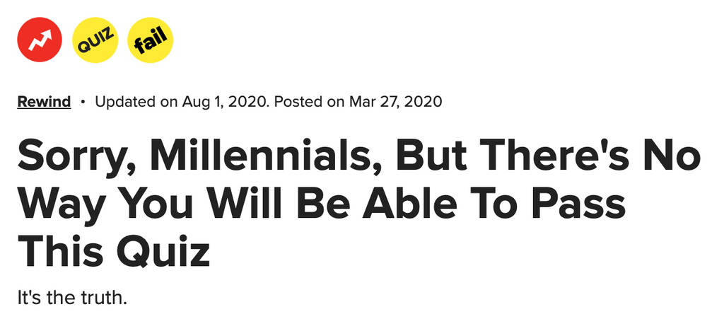 This quiz from BuzzFeed taps into what we discussed above, this time focusing on generational identities.The millennials of BuzzFeed’s audience have been specifically targeted with this content. It isn’t designed to be extremely difficult, but does pose a challenge.