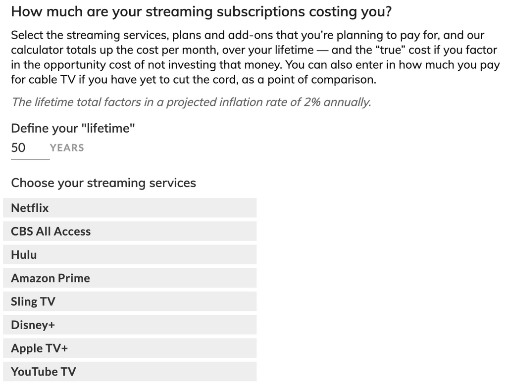 More and more entertainment streaming services are becoming available. This calculator allows users to evaluate what they are actually spending on streaming services. This means they can make financial decisions based on what streaming options offer the best value for money.