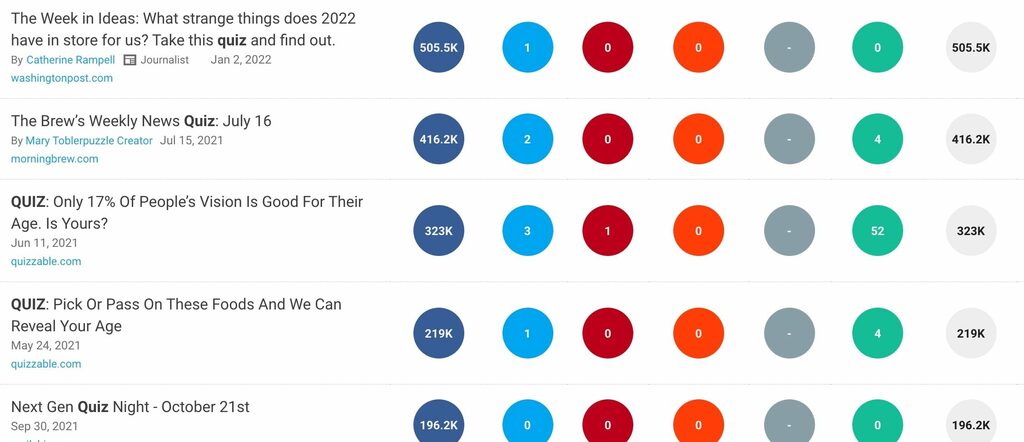 Quizzes have long been a favourite engagement tool, particularly on Facebook. The most shared quiz published during the last 5 years has gotten a total of 5.5 million social interactions, almost all of them from Facebook. Of all the interactive content types, quizzes are the most ubiquitous. They can vary from a simple outcome based quiz through to quizzes that are effectively assessments.