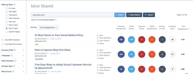 But one thing we’ve started doing this year that’s new for us, and seems to be different than others, is we use BuzzSumo to see what old content could use a nice refresh. For instance, if I type spinsucks.com into the search bar on the homepage right now and then click on the past five years, I can see the most popular content during that time.
