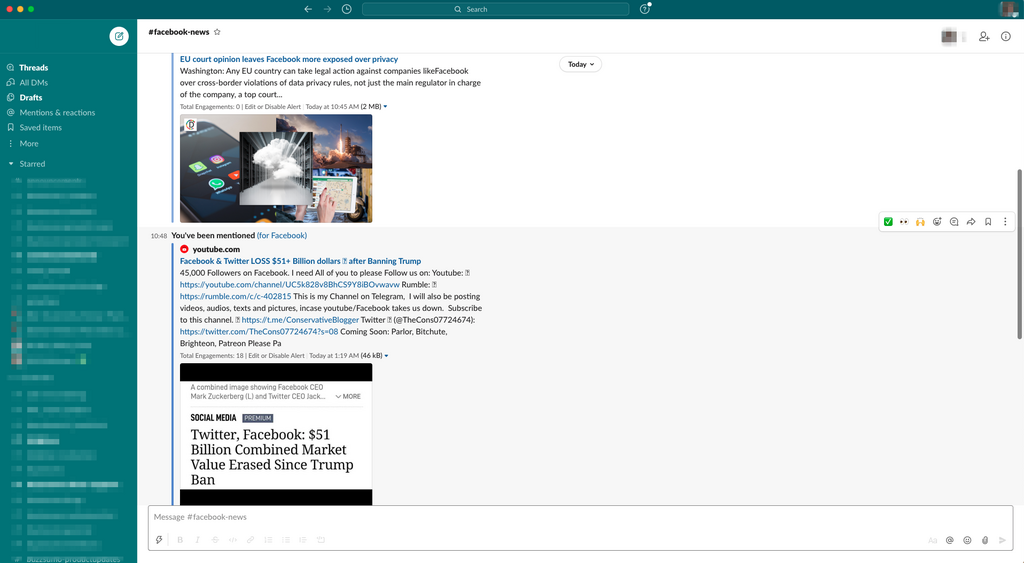 Here’s an example of a ‘Facebook news’ channel I have set up for important Facebook news stories that exceed one thousand shares.