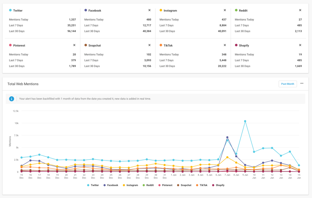 I wanted to see how this compared to news coverage of other platforms who’d also banned Trump, so I set up alerts for them over the week.