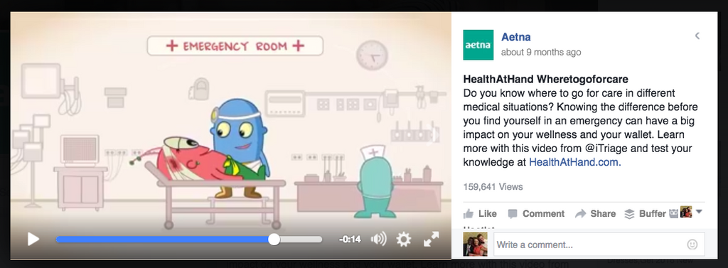 While not as sparse as the BuzzFeed Tasty or Nifty videos, Aetna has a 1:19 minute video describing the different types of US health care providers and when to visit each. It simplifies the decision process by giving one or two examples of when each type of care center is appropriate.