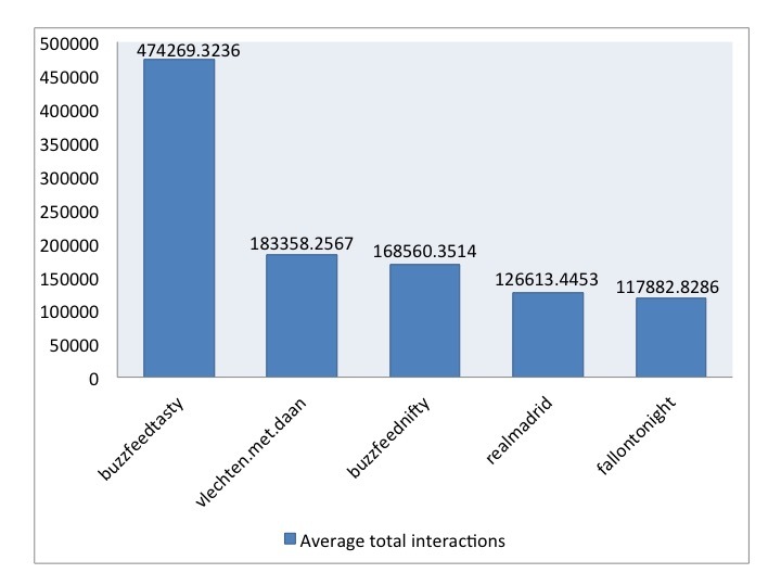 Another way to illustrate the significant number of interactions gathered by BuzzFeed Tasty videos is to compare average total interactions with average total interactions from the other top pages in our sample.