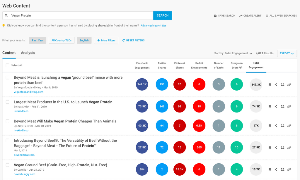 Now that you have a list of potential pieces of content to repurpose you can double-check Evergreen Scores and total engagement across different channels, in BuzzSumo’s Content Analyzer.