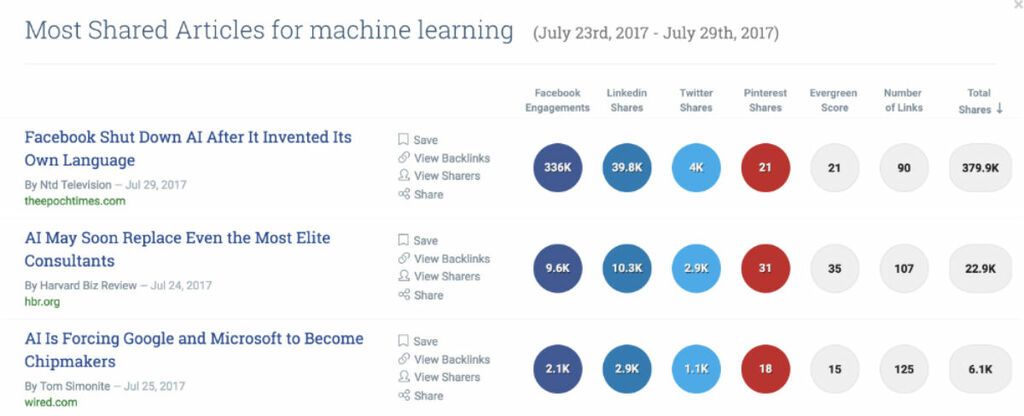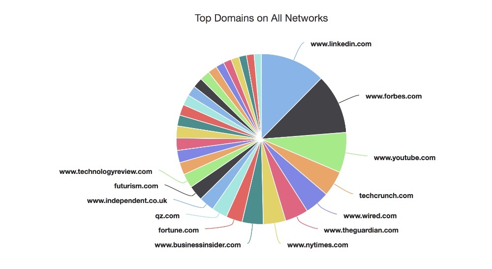 We can see which sites are getting the most shares for their articles on AI. Interestingly articles published about artificial intelligence on LinkedIn.com get more shares in total than articles published on other domains. This may reflect growing interest in the business applications of artificial intelligence and may lead us to publish more content directly on LinkedIn as it’s become more of a primary source.