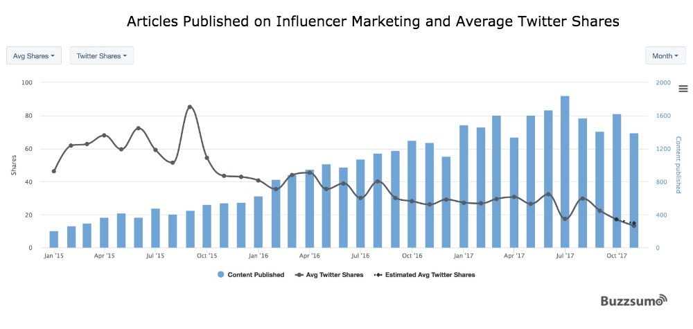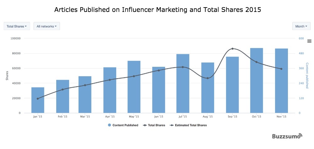 What we typically see at BuzzSumo is that as interest in a topic grows, the number of articles published about that topic increases and both the total shares and average shares of those articles also increase. This is when a trend is having its moment. We can see this below for articles published about influencer marketing in 2015.