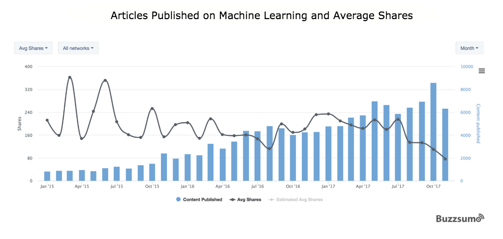 Since May we can see that total shares have been falling, however, the volume of content published about machine learning has continued to increase. The consequence of these two trends is that average shares per post has been falling as we can see below. To switch to average shares we just use the top left drop down.