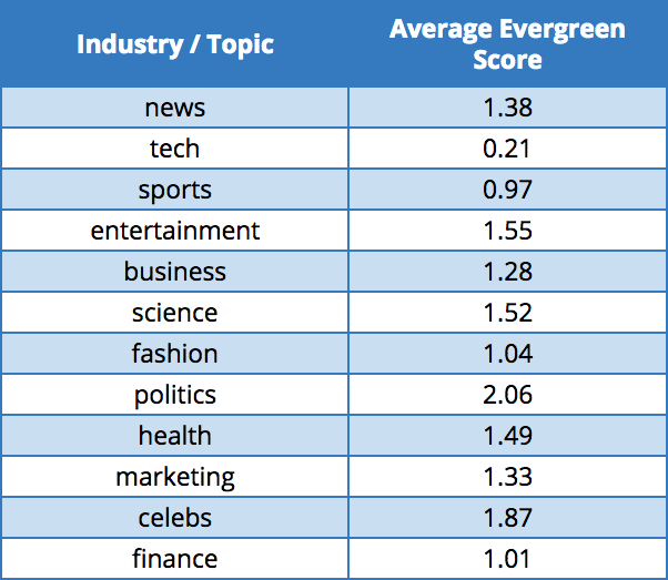 The content in our study had an average Evergreen Score of 2.9, and a median evergreen score of 1.6. This is high compared to averages from across the web. A summary of evergreen scores for different industries, including B2B and B2C content is below.