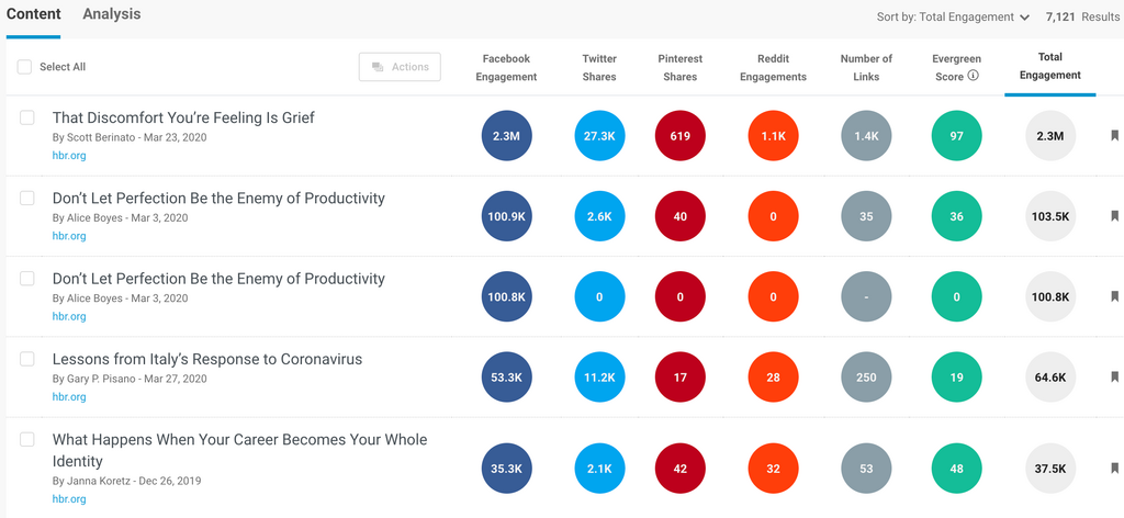 In addition to looking at these blog posts, articles and videos through the lens of social shares, we also evaluated the lasting impact of the content, using BuzzSumo’s Evergreen Content Score.