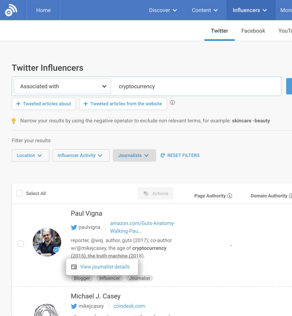 One way to find influential authors is to hone in on top journalists. Journalists write for super authoritative publications with a huge reach.