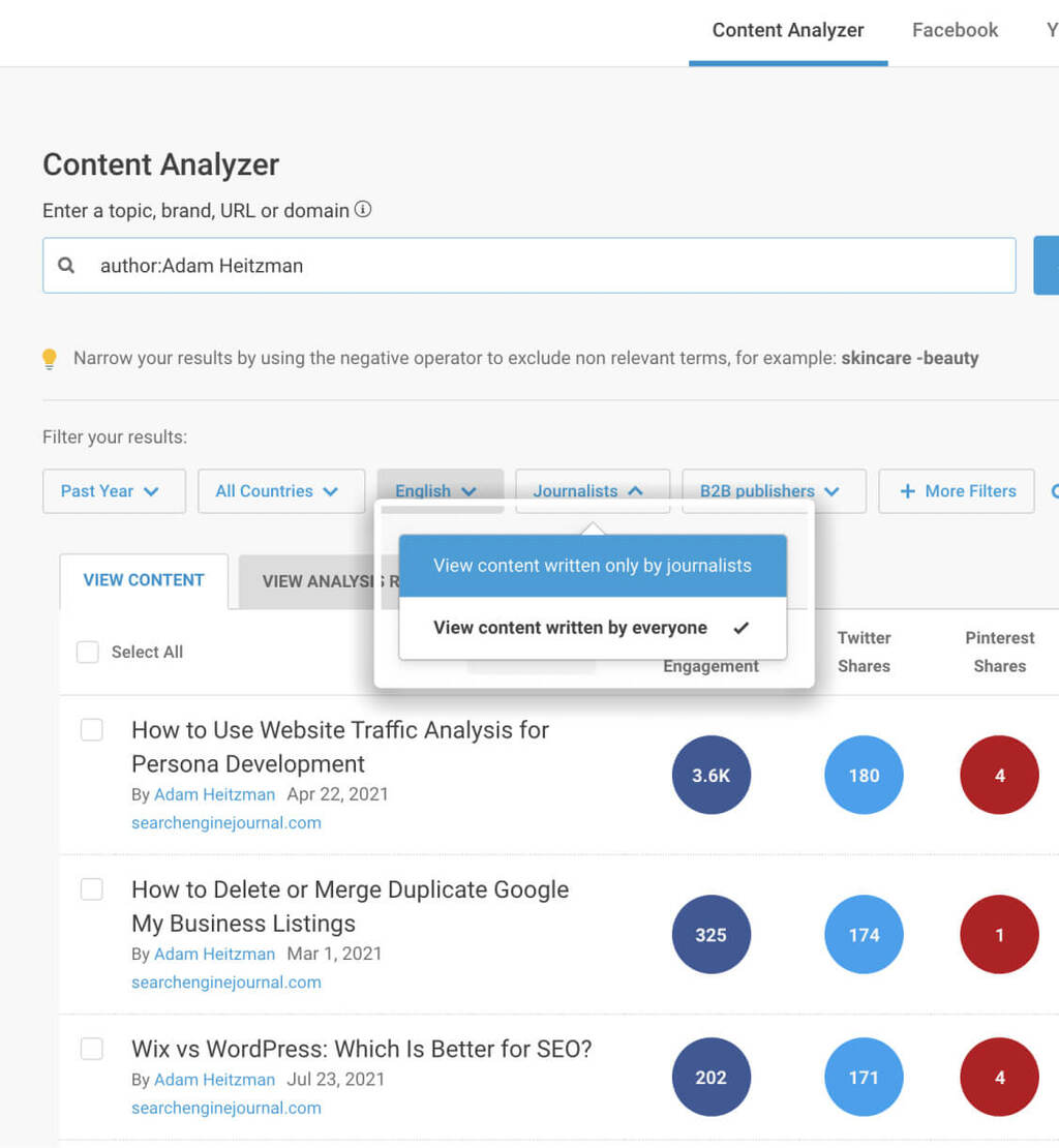 In that same Content Analyzer search, you can also filter to find journalists.
