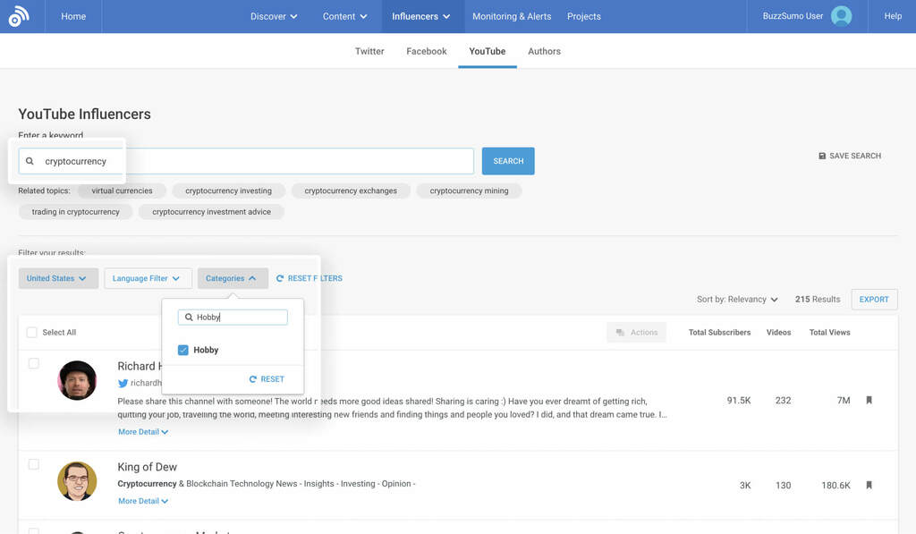 To find these influencers you can simply enter your topic of “cryptocurrency” into the YouTube Influencers tool.