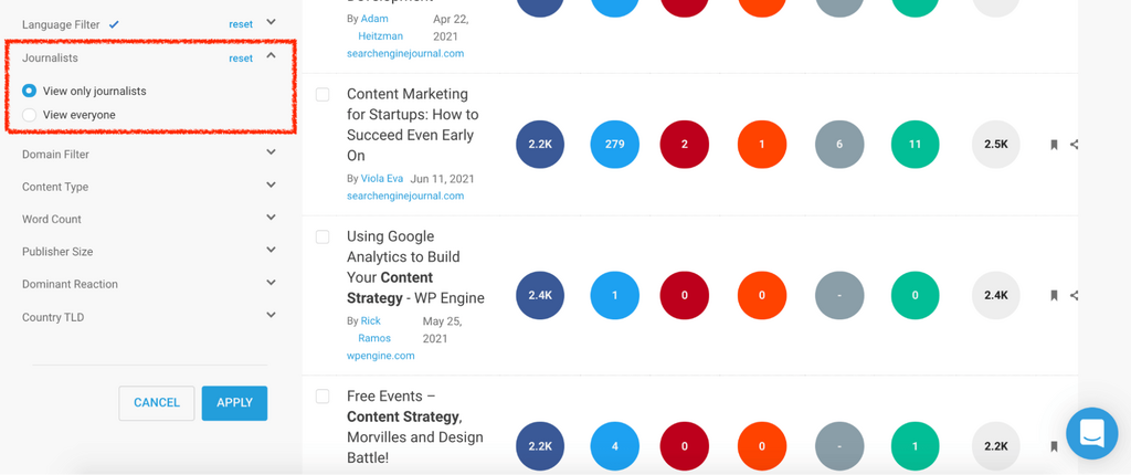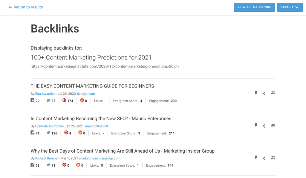 This tool helps you understand the types of articles that are linking to content, and gives you a breakdown of their engagement, so that you can outreach to authors that have the power to push your content furthest.