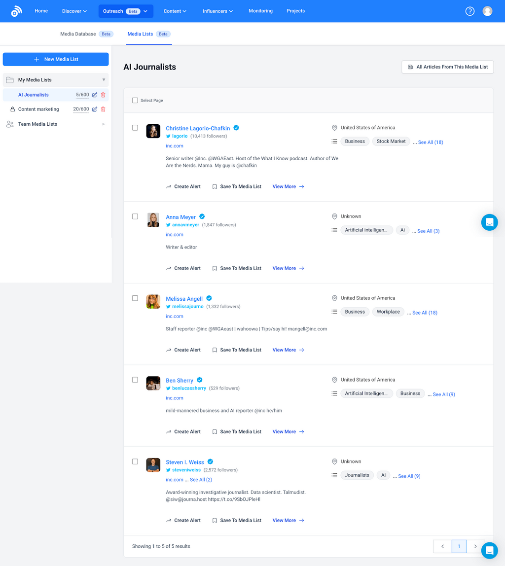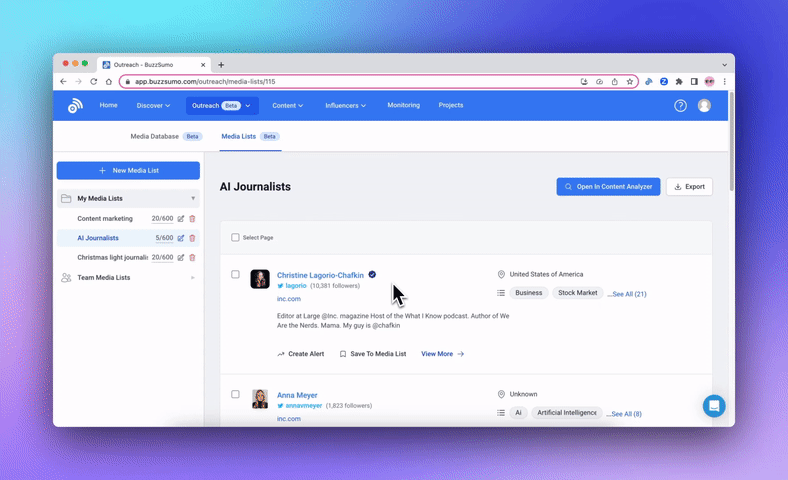 BuzzSumo's Media Lists tool is a powerful feature that allows you to save and export the details of journalists most relevant to your project, campaign, or client.
