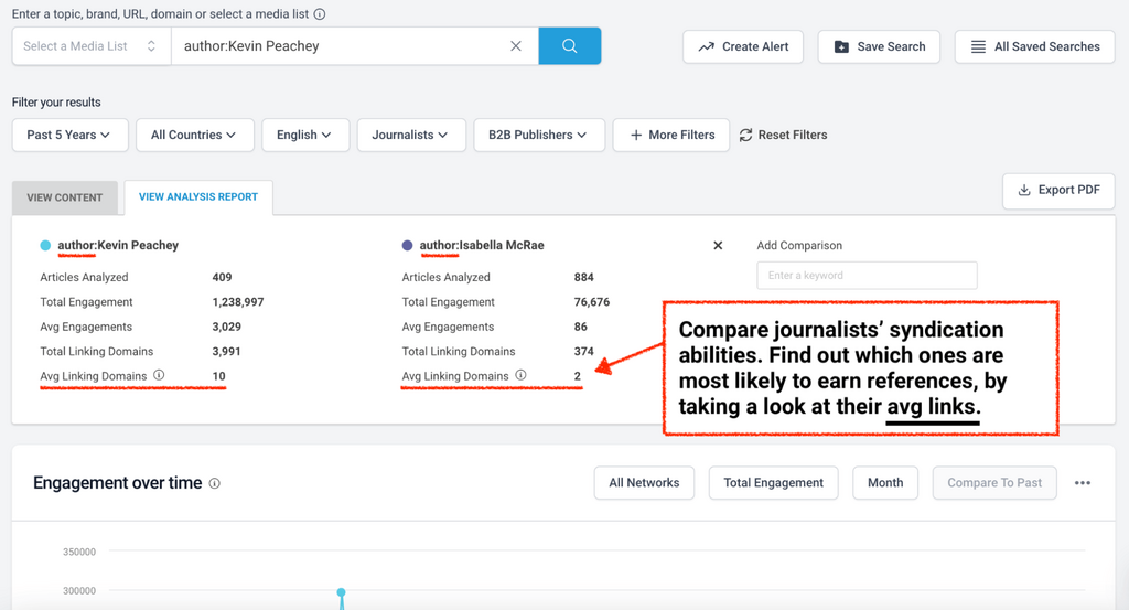 Once a journalist has caught your eye, check out their beat, article engagement, and publications.