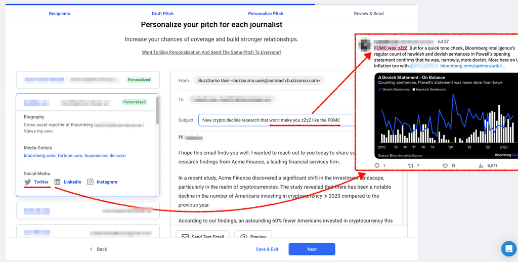 Here's an example of a personalized subject line we managed to research and write in under 5 minutes, simply by clicking a journalist's social profile there on the left.