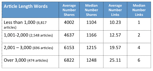 We took the top 10,000 most shared posts and analysed these by word length. Our findings confirm what we have found in previous studies. Namely that most content is less than 1,000 words and that on average, longer form content, particularly over 2,000 words, gains more shares and significantly more links.