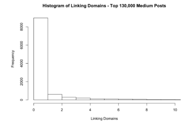 The average number of links to these Medium posts from unique domains (linking domains) was 2.4. However, the median was zero i.e. 50% of posts in our sample of the 132,000 most shared articles on Medium received no links. The upper quartile was just one i.e 75% of posts received one link or no links. There was also no correlation of shares and links.