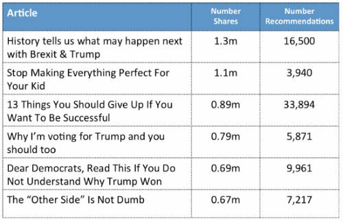 49 of the 100 most shared posts on Medium last year were about the US election or related politics. There were over 5,000 posts about Trump alone and these tended to get higher shares, with the top posts typically gathering tens of thousands of shares. The average shares of Trump posts was 1,241 compared to 379 for our sample as a whole.
