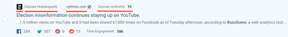 1. In BuzzSumo’s crisis monitoring tool, each returning article is accompanied by the amount of engagement it attracted on the social media networks Facebook, Twitter, Pinterest, and Reddit.