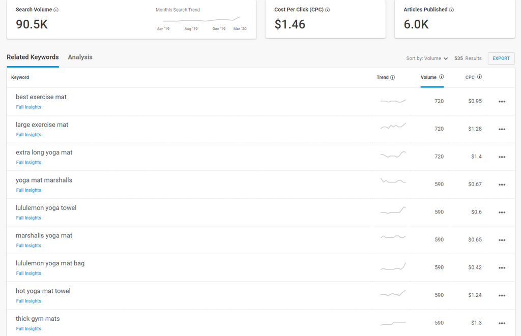 Say you’re running a website that sells yoga mats. You’d type “yoga mats” into the BuzzSumo keyword research tool and voila: