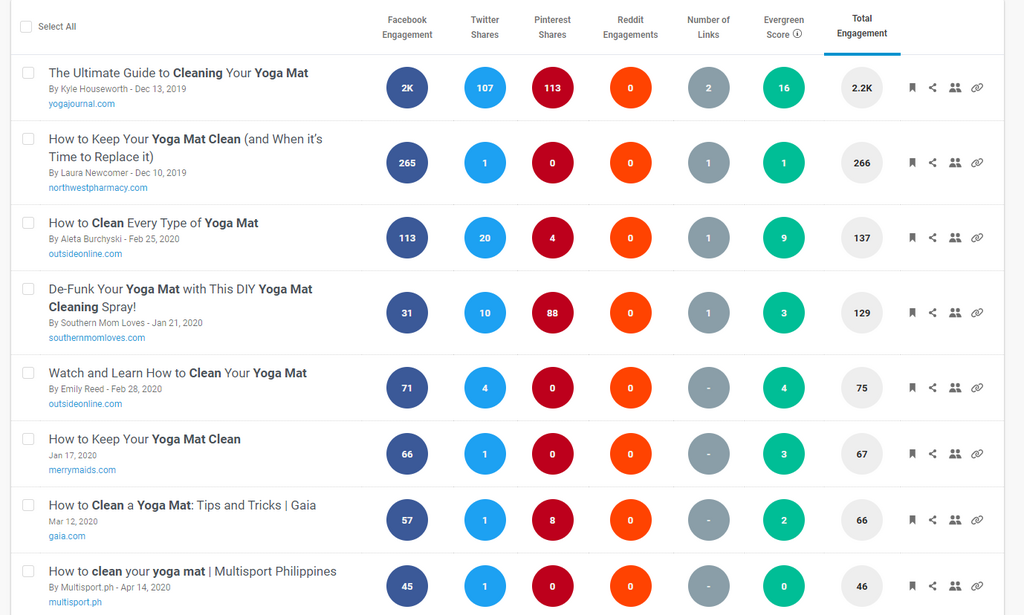 You can also head over to the Content Analysis tool where you’ll find the most popular posts. You’d want to run a search for, say, “yoga mat cleaning” and read the top-shared articles so you can differentiate yourself.