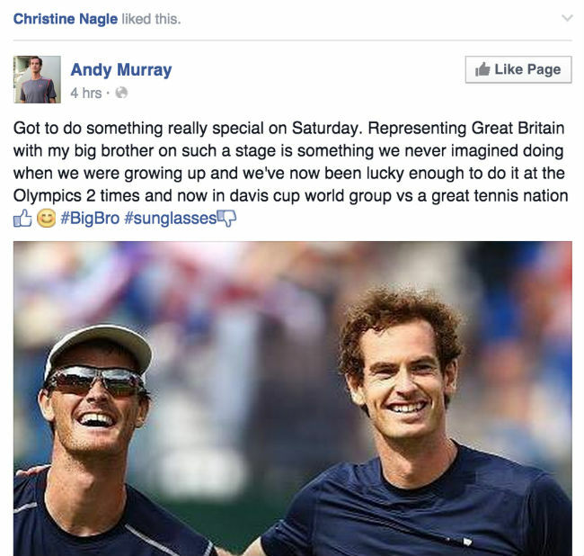 As an example of a ‘like’ being a quick way to share content, my partner liked a post by Andy Murray tonight and it immediately appeared at the top of my News Feed along with the image, as you can see below.
