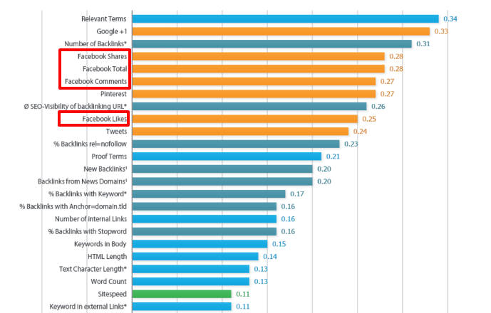 I have highlighted the Facebook correlations which are of interest to us here. We can see that Facebook shares have a slightly higher correlation than comments or ‘likes’ to Google rankings. However, we can also see that the correlation of total Facebook interactions; namely shares, likes and comments; is the same as that for Facebook shares. This does not mean that higher Facebook activity causes higher Google rankings but it does show that total Facebook interaction activity has the same correlation as Facebook shares.