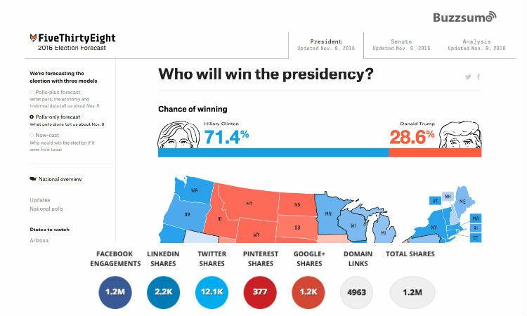 Whilst we are on the topic of the US election, the Five Thirty Eight forecast page by Nate Silver was also very well shared. This page was referenced by more sites than almost any other piece of content and was linked to from almost 5,000 different domains. Again it shows that authoritative data-driven posts do well in both links and shares, though we suspect pollsters will be less revered after this election.