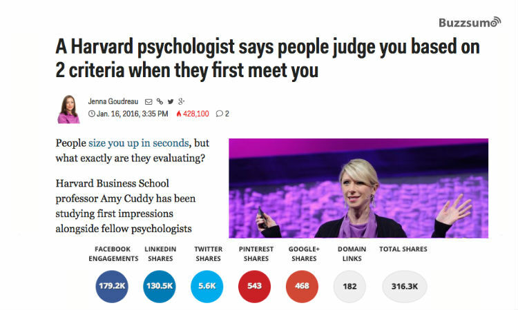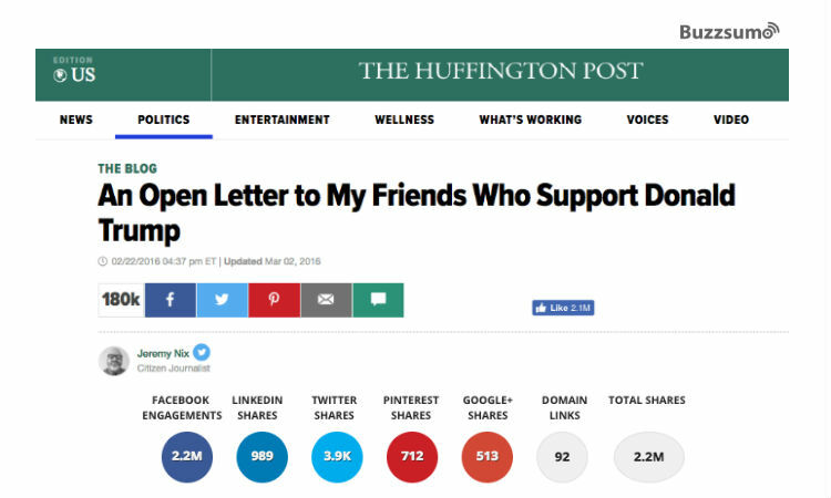 Michael Moore’s post below forecast that Trump would win the election and had over 1 million engagements and over 2,000 links from different domains. Big personality + strong opinion + list post format = viral post.