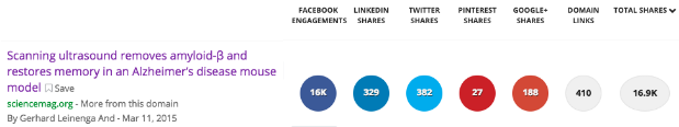 The top post was this potential good news story on Alzheimer’s, reported by the Science Alert site, which gained the most interactions on Facebook. Interestingly the article received very few links. This is because most people linked to the original research rather than the new report. The original research article received over 400 domain links as we can see below.