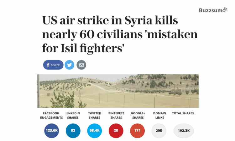 Twitter is a much smaller network than Facebook and people also use it less frequently according to the latest Pew research. As a consequence we see fewer content shares on Twitter. However, it does appear that breaking news stories still gain a lot of traction, for example, this Daily Telegraph article.