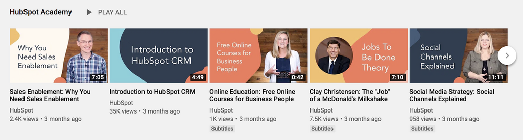 This playlist is designed for HubSpot customers. It was originally a separate Youtube channel but HubSpot found that combining their channels into a single channel increased the chances of their videos being found in the YouTube algorithm, not least because one factor in the algorithm was the number of videos watched by users in your channel. HubSpot explained this change in a YouTube Video. While no longer in a separate channel these videos do have a distinct HubSpot Academy branding and tone.