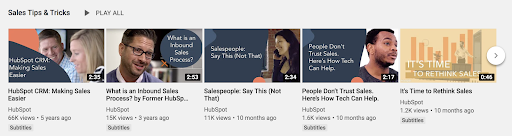HubSpot understands how YouTube is leveraged by their audience to keep up with industry trends, best practices and practical tips to save time and be more effective. Thus while HubSpot uses YouTube to publish and distribute video adverts, the majority of their YouTube content is focused on education. The HubSpot YouTube channel has become a major source of resources for marketers; salespeople; and customer support, service, and success reps. Few people arrive at a YouTube channel to browse, they normally come for a specific purpose which may be related to a business challenge or a practical challenge they are facing. HubSpot recognises this and has organised their content into playlists. For example their playlists are organised into: