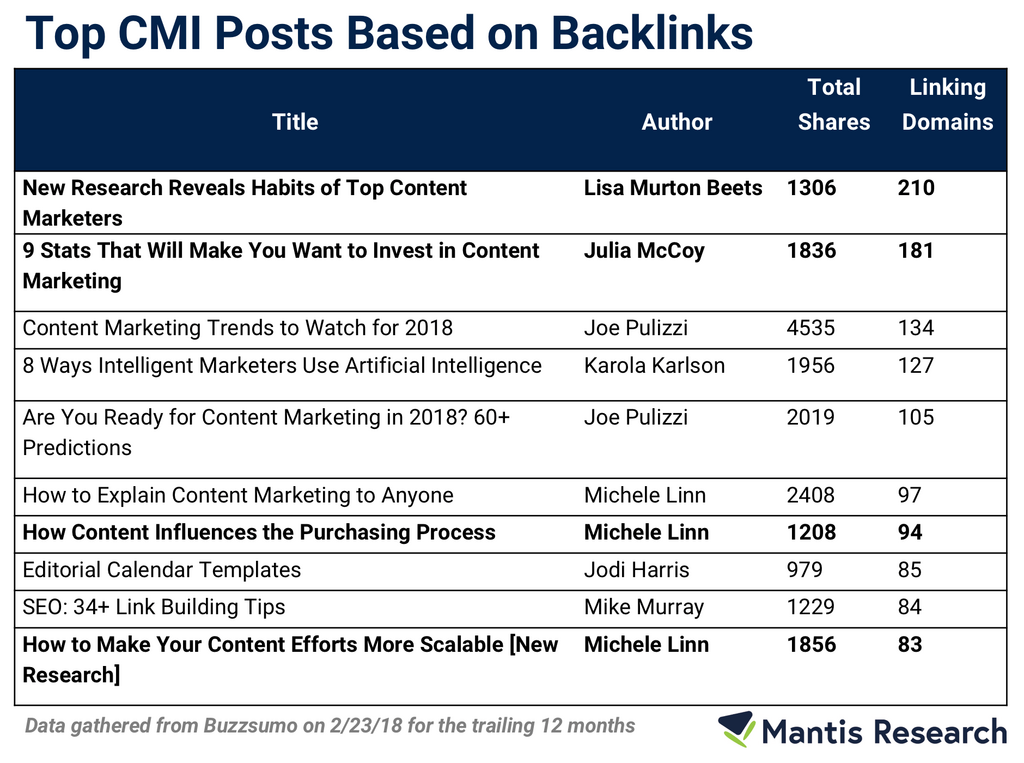 To see if this theory holds true, I used BuzzSumo to understand which posts on Content Marketing Institute received the most backlinks (for a frame of reference, they used to publish daily, and now they publish 5 days per week — so they have a lot of content!). Four of the top ten posts are focused on research: