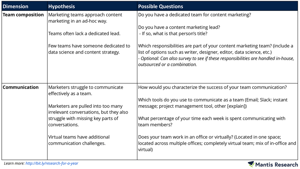 I recently shared and explained the framework I use to think through the story the research will tell — and get a year’s worth of content. You can read about the process in more detail on CMI, but here is a chart that lays out the three three things you need to document for your survey: