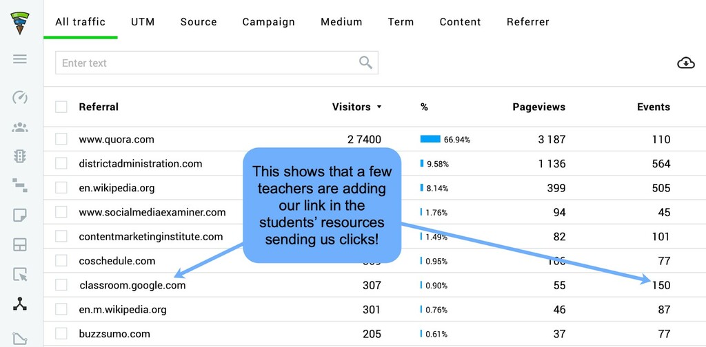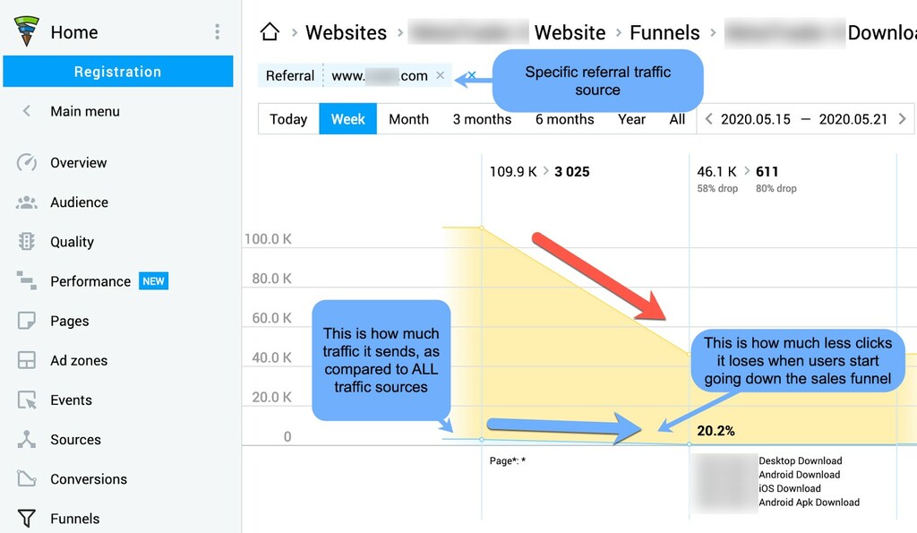 Apart from that, use your on-site analytics solutions to spot backlinks that actually send traffic. I use Finteza to monitor how effective my links are. You can easily select any of your referring domains and see how the visitors it sends is interacting with sales funnel and CTAs: