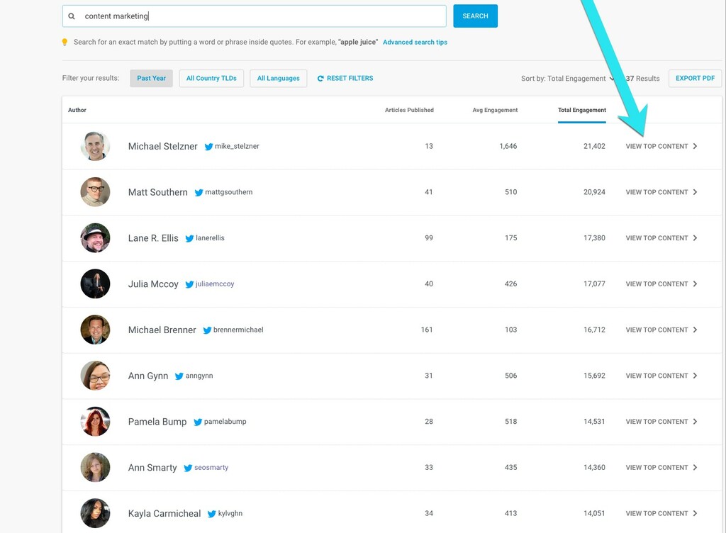 BuzzSumo is always the first content research tool I am using in my outreach campaigns. Its “Authors” tool inside the “Influencers” section offers an immediate list of top authors on your topic.