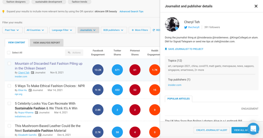 1. Whilst I am doing my initial research on BuzzSumo, I will find out who wrote the articles I was interested in, using the Journalist Profiles feature.