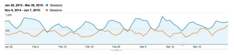 The results? Well, take a look at our traffic through Pinterest for the 60 days before we made the change (orange) and the 60 days after we made the change (blue):