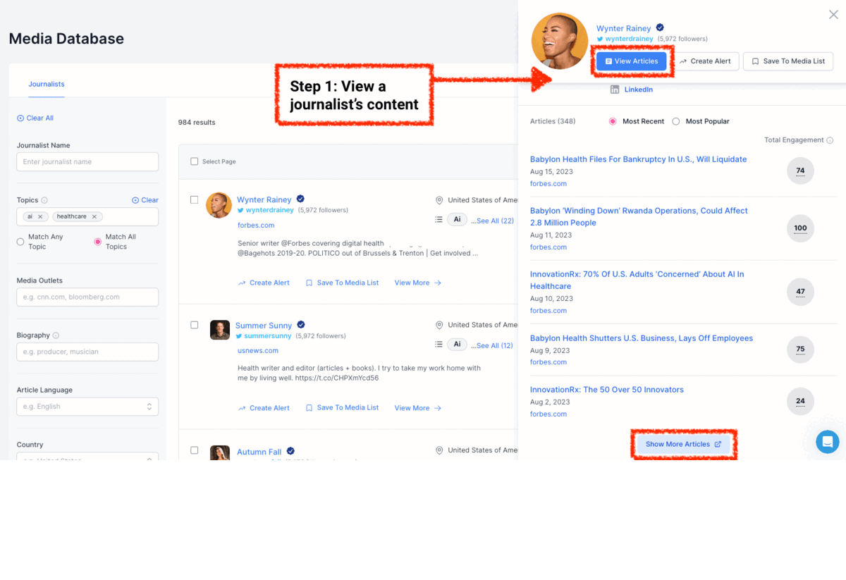 In BuzzSumo’s Media Database you can find journalists writing about 150K+ topics, and expand your chances of landing coverage by tracking down the journalists who write across multiple beats – because if they can't use your story for one publication, they may be able to publish it in another.