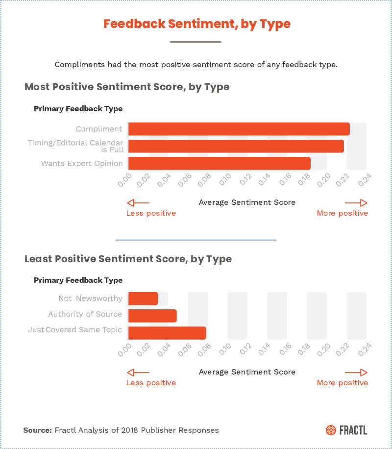 For example, in 2018, Fractl analyzed over 300 responses from journalists and found that pitches considered “not newsworthy” achieved the least positive sentiment:
