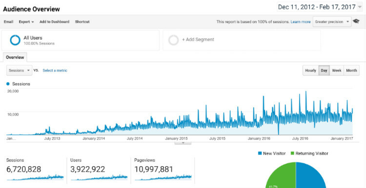 Brian has kindly shared his analytics data below so we can see how his traffic has grown consistently over time. His 53 posts have attracted almost 4m visitors and 11m page views.