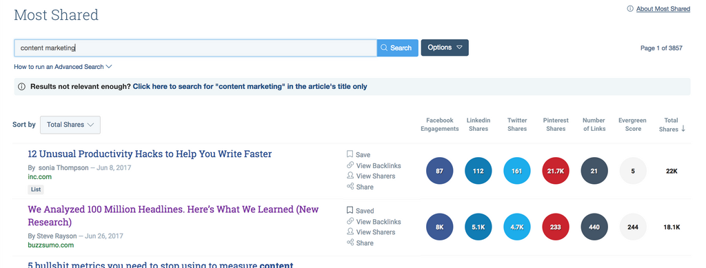 If you aren’t sure what types of content perform best for a particular domain, take time to study the social shares of content at their site. BuzzSumo’s content analysis and content trends tool are a great way to speed up the process.