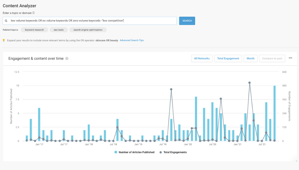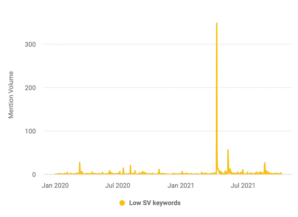 But, as you can see below, social engagement around “low-volume keywords” tells a different story.